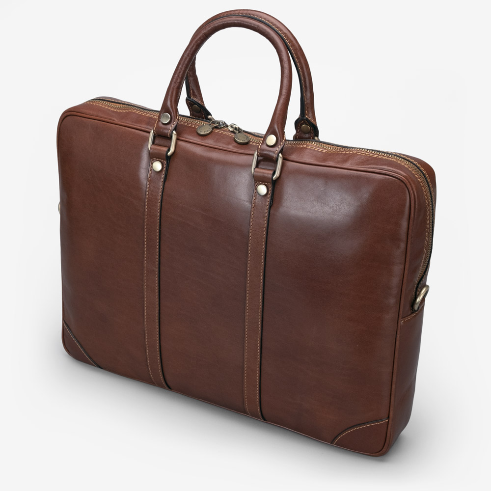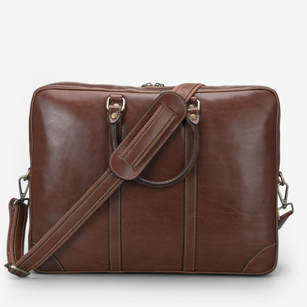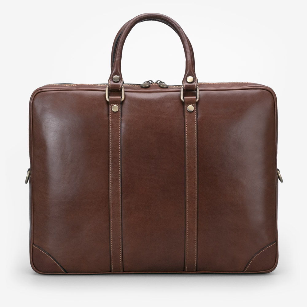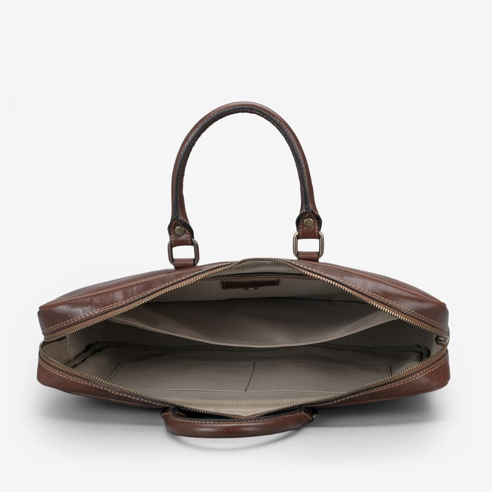 Servietă din piele naturală de culoare maro alună. Are compartiment separat pentru un laptop de cel mult 15,6".